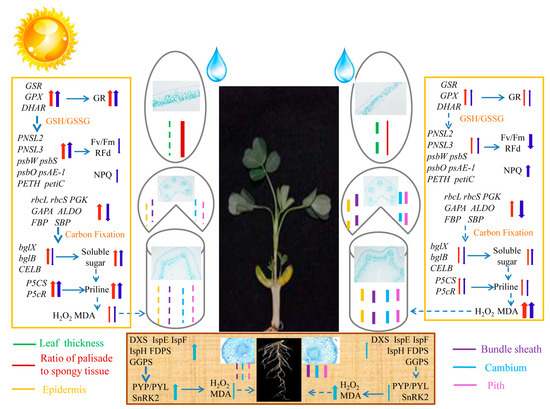 During drought stress conditions, leaves are the most vulnerable parts of plants [10]. This is because the palisade tissue, sponge tissue, and guard cells in leaves all contain chloroplasts, which are the main action centers for photosynthesis [11]. Plant stems pump water and nutrients and support the roots and leaves, which act as transforming centers for water storage, retention, and transportation [12]. Under drought stress, the parenchyma cells in the stem atrophy, the diameters of the pulp cavity and cell spaces are reduced, the cuticle of the stem prevents the plant from wilting, and the sclerenchyma and wood fiber tissues strengthen the support of the axial organs to alleviate damage [13]. Drought also affects the size and distribution of cells in the epidermal layer, which are in direct contact with the external environment [14]. The pulp has a protective effect on the vascular tissue and is the primary vehicle for water storage in the mid-column [15].