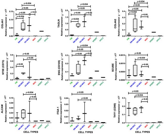 - Brendel, C.; Kuklick, L.; Hartmann, O.; Kim, T.D.; Boudriot, U.; Schwell, D.; Neubauer, A. Distinct gene expression profile of human mesenchymal stem cells in comparison to skin fibroblasts employing cDNA microarray analysis of 9600 genes. Gene Expr. 2005, 12, 245–257. [Google Scholar] [CrossRef] [PubMed]