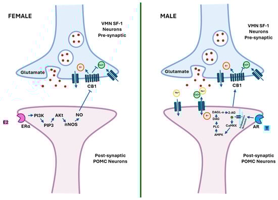 A schematic illustration summarizing the endocannabinoid signaling occurring at VMN SF-1/ARC POMC synapses in females and males. In females, estrogen binding to ERs increases the activity of PI3K and the production of PIP3, which upregulates Akt and stimulates nNOS. Endocannabinoid levels in the synaptic cleft are then reduced by nNOS through the inhibition of their synthesis, the improvement of their catabolism, and the promotion of their reuptake. Moreover, the NO produced may act in a retrograde fashion to uncouple CB1 from its ligands in the glutamatergic nerve terminal. On the other hand, testosterone in males activates a putative membrane AR and raises the levels of intracellular calcium. A calcium increase activates CaMKK and the AMPK complex, improving the production of 2-AG by DAGL-α. The 2-AG release can retrogradely activate presynaptic CB1 in the VNM SF-1 neurons and inhibit calcium entry, ultimately decreasing glutamatergic input. VMN: ventromedial nucleus; SF-1: steroidogenic factor-1; ARC: arcuate nucleus; POMC: proopiomelanocortin; PI3K: phosphatidylinositol-3-kinase; PI3P: phosphatidylinositol-3-phosphate; nNOS: nitric oxide synthase; NO: nitric oxide; CaMKK: calmodulin-dependent protein kinase; AMPK: AMP-activated protein kinase; Akt: protein kinase B; ESRɑ: estrogen receptor ɑ; E2: estradiol; AR: androgen receptor; 2-AG: 2-arachidonoylglycerol; PLC: phospholipase C; DAGL: diacylglycerol lipases; CB1: cannabinoid receptor.