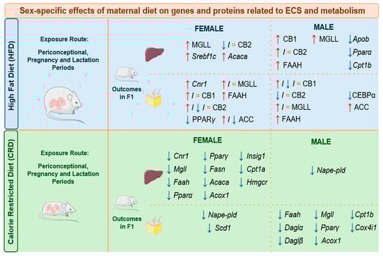 Over the years, it has been demonstrated that the ECS can regulate adipose β-oxidation, hepatic lipid and cholesterol biosynthesis in a sex-dependent manner, specifically in mammals. In addition, changes in nutritional programming due to maternal dietary restrictions during fetal development may play a significant role in the early-life programming of the ECS and the long-lasting effects of this on energy metabolism. This point will be now reviewed, and the main effects of maternal diets at the gene and protein levels are summarized in Figure 2.