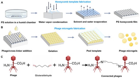 Scheme of the preparation of bacteriophage microgels using honeycomb film as a template. (A) A schematic illustration of the process for the preparation of honeycomb templates. (B) Schematic image of preparing phage microgels: Honeycomb film is plasma-coated to increase hydrophilicity; Phage and crosslinker mixture solution are cast on the film and placed in the vacuum; The top layer of the film is peeled off using adhesive tape; The phage microgels are isolated after removing the film. (C) Crosslinking reactions of bacteriophages with glutaraldehyde (GA).
