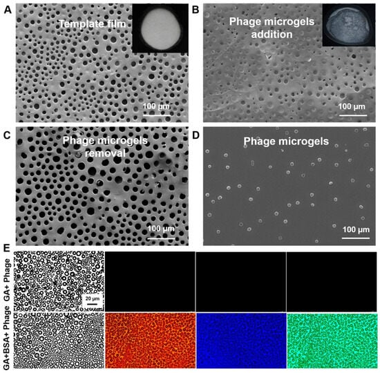 To create the honeycomb film template, we prepared a 5% PS (polystyrene) solution (dissolved in chloroform) and distributed it on a pristine glass side within a humidity chamber. The uniform open-ended spherical micropores through the film surface characterized by SEM suggested that the honeycomb film template had been successfully prepared using the breath figure method (Figure 2A). After the treatment of the film with plasma, the phage suspension containing phages and crosslinkers was cast on the film in a vacuum-drying oven with a low-pressure environment for gelation. After gelation for 12 h, the original phage suspension inside the pores successfully turned into an ordered array of solid phage microgels (Figure 2B). After the top half of the pores were peeled off from the honeycomb film with adhesive tape, the gelatinized phage microgels remained inside the pores of the film without damage (Figure 2C). By immersing the film in sterile water with sonication, phage microgels were conveniently isolated from the template (Figure 2D), proving the microgel array inside the template is detachable. In addition, the phage microgels made with GA and BSA showed significant autofluorescence in blue, red, and green channels, due to the electronic transitions such as the n–π* transitions of C=N in the Schiff’s base generated from the crosslinking reaction []. The autofluorescence phenomenon potentiates the non-destructive imaging capability of the microgels, allowing for further microgel count and preparation efficiency assessment (Figure 2E).