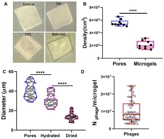 Assessment of the preparation efficiency of phage microgels. (A) The plaque inhibition of phage microgels with GA, EDC, and BSA+GA as crosslinkers on the lawn of S. typhimurium 14,028. (B) Pore density of the template and produced microgel count from every square centimeter of the template (n = 9 independent films). (C) Size distribution of the template pores, hydrated microgels, and dried microgels (n = 20 pores measured 3 independent templates). (D) Calculation of the number of phages per microgel using BSA+GA as crosslinker. Box plots show minimum to maximum (whiskers) with all data points. Data are mean ± s.d. Significance was calculated by one-way ANOVA with Tukey multiple comparisons test; **** p < 0.0001.