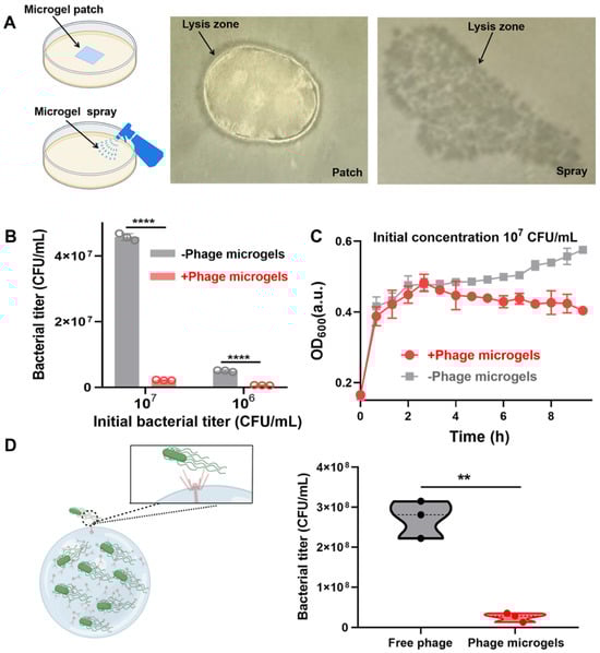 Assessment of anti-microbial activities of phage microgels. (A) Photos of phage microgel-embedded patch and phage microgel spray forming lysis zones on the lawn of S. typhimurium 14,028. (B) Final titer count of S. typhimurium 14,028 incubated with and without phage microgels in PBS after 9 h at the initial bacteria concentrations of 107 and 106 CFU/mL. (C) Kill curves for S. typhimurium 14,028 suspension incubated with and without phage microgels in TSB lawn for 9 h at the initial concentration of 107 CFU/mL. (D) Schematic of a phage microgel binding to the host bacteria. (left) Final titer count of S. typhimurium 14,028 incubated with phage microgels and free phage in TSB after 9 h at 107 CFU/mL (right) (n = 3 independent experiments per bacterial concentration). ** p < 0.01, **** p < 0.0001.