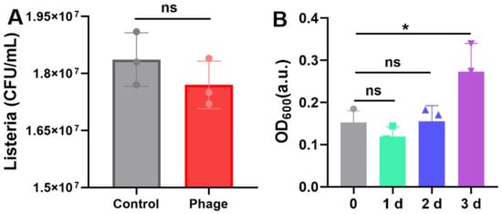 Assessment of the specificity and storage stability of phage microgels. (A) Anti-Listeria activity of the S. typhimurium 14,028-embedded phage microgels. (B) Anti-S. typhimurium 14,028 activity of the S. typhimurium 14,028-embedded phage microgels after being stored for 1, 2, and 3 days at 4 °C. n = 3; data are mean ± s.d. Significance was calculated by one-way ANOVA with Tukey multiple comparisons test; ns, not significant, * p < 0.05.