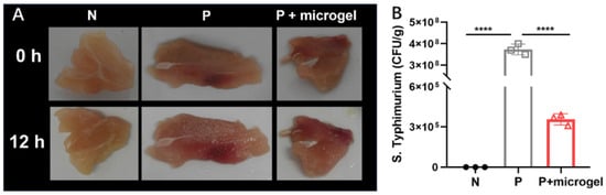Anti-microbial activity of phage microgels on chicken samples. (A) Pictures of chicken samples treated with water (negative control, N), S. typhimurium 14,028 (positive control, P), and S. typhimurium 14,028 with phage microgels, (P + microgel), at 0 and 12 h. (B) Bacterial titer count of the collected bacterial suspension from contaminated samples (n = 3 independent chicken samples per group). Significance was calculated by one-way ANOVA with Tukey multiple comparisons test; **** p < 0.0001.