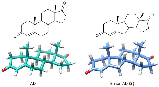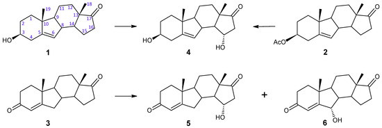 The study presented in this work showed that hydroxy derivatives (but not 17β-hydroxy compounds, which are products of steroidal 17β-dehydrogenase) were also obtained after the conversion of B-nor analogues of natural steroid hormones DHEA and AD (Figure 1). B-nor-DHEA (1) was prepared from B-nor-DHEA acetate (2) by its base hydrolysis. B-nor-AD (3) was synthesized by Oppenauer oxidation of 1. The structures of the substrates and obtained products were established by using spectroscopic techniques (1H NMR and 13C-NMR) (Supplementary Materials Figures S1–S8).