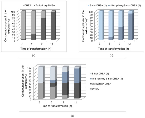 The composition of extracts obtained after transformation of (a) DHEA, (b) B-nor-DHEA (1) and (c) an equimolar mixture of DHEA and B-nor-DHEA (1). * Determined by GC analysis. The presented values are the average of three independent experiments and relative differences between the border values have not exceeded 5%. Exact mean values and standard deviations are provided in Supplementary Materials—Table S2.