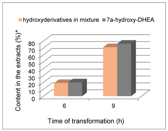 To test this hypothesis, we performed simultaneous transformations of DHEA, its analog 1 and an equimolar mixture of both substrates. The results are presented on the graphs (Figure 3). A comparison of the percentage of metabolites of both substrates in the extracts obtained after the third and subsequent hours of transformation indicates that the reaction rate increases significantly over time. The reaction mixture after 3 h of DHEA incubation contained 4% of 7α-hydroxy-DHEA; after another 3 h its content increased to 20%; after another three hours it reached 76%; and finally, after another 3 h, almost complete substrate conversion was noted. A similar conversion profile in 3-h time intervals was observed in the transformation of B-nor-DHEA (1). The content of 15α-hydroxy-DHEA (4) increased from 1% to 11%, 45% and, finally, 92%, respectively. These results suggest that both substrates are inducers of the enzyme(s) catalyzing their hydroxylation.