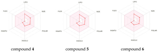 The bioavailability radars of metabolites 4–6. The pink area represents the optimal range for lipophilicity (XLOGP3 between −0.7 and +5), size (MW between 150 and 500 g/mol), polarity (TPSA between 20 and 130 Å2), insolubility (Log S ESOL between −6 and 0), insaturation (fraction Csp3 between 0.25 and 1) and flexibility (rotatable bonds between 0 and 9).