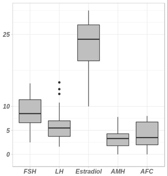Hormonal assays and antral follicle counts in the cohort of patients with diminished ovarian reserve. Hormonal assays (FSH, LH, Estradiol and AMH) together with the antral follicle count (AFC) in patients. The Y scale unit is variable according to each parameter represented on the X-axis. Normal range: AMH (7–20.7 pmol/L); respectively, ranges for follicular, ovulatory, luteal phases and menopause are the following: FSH (IU/L): (2.9–12), (6.3–24), (1.5–7), (17–95); LH: (IU/L) (1.5–8), (9.6–80), (0.2–6.5), (8–33); Estradiol (ng/L): (19.5–144.2), (63.9–356.7), (55.8–214.2), (≤32.2).