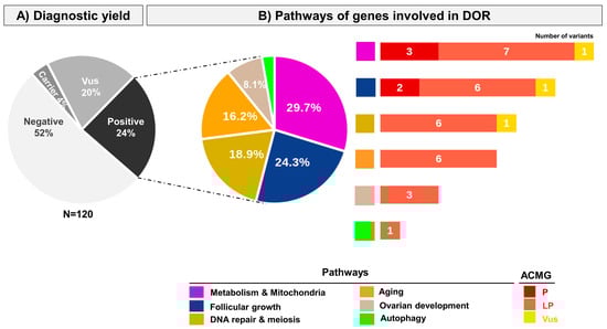 Genetic studies of a cohort of patients with DOR. Patients were studied by a custom-made targeted NGS comprising 88 genes. (A) Diagnostic yield according to ACMG criteria: variants are classified according to the American College of Medical Genetics (ACMG) guidelines. N = 120: the whole cohort comprises 120 patients with DOR. Vus: variant of unknown significance. Carrier: patients harboring a heterozygous pathogenic variant in a known autosomal recessive POI gene. Positive: the diagnostic yield corresponds to patients carrying pathogenic (P) or likely pathogenic (LP) variants and is 24%. (B) Pathways of genes involved in DOR. The different pathways are indicated with different colors. The pie chart represents the proportion of patients with P or LP variants in a specific pathway: Mitochondria and Metabolism (29.7%), Follicular growth (24.3%), DNA repair and meiosis (18.9%), Aging (16.2%), Ovarian development (8.1%), Autophagy (2.7%). The histograms show the number and type of variants detected in each pathway.