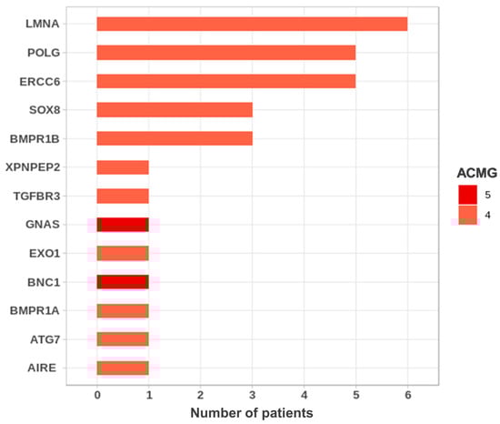 We detected five genes with variants found in at least three patients. These are LMNA, ERCC6, POLG, SOX8 and BMPR1B (Figure 3).