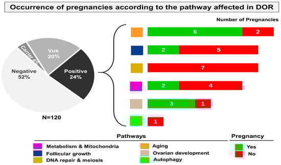 However, no pregnancy occurred in patients with DOR with molecular alterations in DNA repair genes, suggesting a poor prognosis for this gene family that can significantly impair oocyte quality (Figure 4). Patients with mutations of other gene families seem to have a better prognosis of fertility, i.e., genes involved in follicular growth, metabolism and mitochondrial functions, aging and ovarian development. Only one patient presented a likely pathogenic variant in a gene involved in autophagy, which does not allow any conclusions to be drawn.