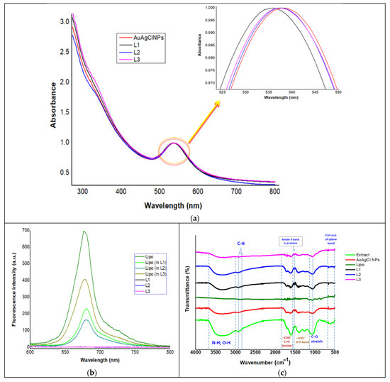 The plant-assisted synthesis of AuAgClNPs was confirmed by UV-Vis absorption spectroscopy. AuAgClNPs exhibited an intense peak at 538 nm, while the yarrow extract did not show any peak in the wavelength region of 500–600 nm (Figure S1, Supplementary Materials). The obtained biohybrids L1, L2, and L3 presented peaks at wavelengths of 536, 537.5, and 538.4 nm, respectively (Figure 1a). Our results are consistent with other scientific reports. For instance, Alti et al. reported the phytosynthesis of gold–silver bimetallic nanostructures from aqueous leaf extracts of coriander, soybean, and fenugreek, which showed peaks at wavelengths of 522, 533, and 541 nm, respectively [22].