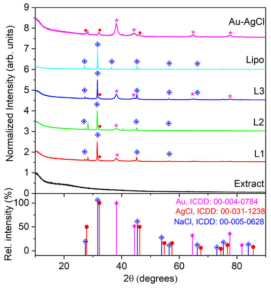 As observed, the yarrow extract is amorphous. The yarrow-derived AuAgCl NPs exhibit major peaks of Au and minor peaks of AgCl. The major peaks of Au are also visible in the XRD spectra of hybrids L1, L2, and L3. The diffraction peaks corresponding to the AgCl were not found in biohybrids L1, L2, and L3 because their preparation route involves the addition of an appropriate volume of liposomal suspension to a certain volume of plant-derived AuAgClNPs. As a result, the bio-derived bimetallic particle suspension is more diluted, and the minor peaks of AgCl are diminished. The formation of AgCl NPs was possible due to the presence of Cl in the soil and, consequently, in the plants, as Cl is an essential micronutrient for oxygenic photosynthetic organisms and is found in the environment at higher levels than those required by plants [32,33]. The presence of Cl in the yarrow extract was further demonstrated by the EDX spectrum (see Figure S5c, Supplementary Materials).