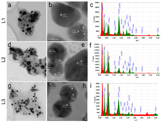 In the case of samples L1, L2, and L3, CTEM images (Figure 3a,d,g) show that the morphologies and size of NPs do not change. They also demonstrate that biohybrids have the intended concentration of AuAgClNPs. In Figure 3g, corresponding to a concentration of AuAgClNPs of 33.3%, NPs are less agglomerated than in Figure 3d, corresponding to a concentration of AuAgClNPs of 66.7%. In HRTEM images (Figure 3b,e,h), the measured fringes correspond to the expected crystalline structures: cubic Au and cubic AgCl. Like in the case of AuAgClNPs, the EDX spectrum for L1, L2, and L3 samples (Figure 3c,f,i) contains the same chemical elements: Au, Ag, Cl, O, Na, Si, K, Ca, and Fe.