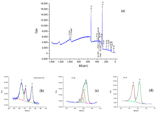 The XPS results also confirm the formation of the AuAgCl nanoparticles. As shown in Figure 4a, the elements C, O, N, Si, K, Ca, Cl, Ag, and Au are clearly present, indicating the existence of Au and AgCl within the sample. In the high-resolution XPS spectrum presented in Figure 4b, three peaks located at 368.19 eV (peak A), 374.13 eV (peak B), and 378.04 eV (peak C) were found. Peaks A-B represent the Ag 3d doublet. The two lines have a doublet splitting of approximately 6 eV and an area ratio of about 3:2. The binding energy indicates AgCl, which is consistent with the literature [38,39]. Peak C represents K2s. In Figure 4c, the high-resolution XPS spectrum of Cl 2p is presented. Through fitting, the 2p3/2 (peak A, at 198.32 eV) and 2p1/2 (peak B, at 199.93 eV) doublets were identified, with a splitting of 1.6 eV and an area ratio of approximately 2:1. Peaks C-D indicate bonds with C in organic compounds. Peaks A-B indicate metal chlorides, including KCl and AgCl, which are difficult to differentiate, especially because the amount of Ag is very small compared to K. In Figure 4d, the high-resolution XPS spectrum of Au 4f is presented, consisting of two lines, Au 4f7/2 and Au 4f5/2, with a splitting of approximately 3.6–3.7 eV and an area ratio of about 4:3. The binding energy is very close to the ISO standard for metallic Au used for calibration (which is 83.96 eV). A bond with Cl would have produced peaks with binding energies above 84.4 eV. Therefore, the peaks at 83.99 eV and 87.65 eV correspond to metallic Au [38,40]. However, by correlating the results obtained from XPS with those from TEM and XRD, we can confirm the presence of silver chloride particles. This result is consistent with the literature [41].
