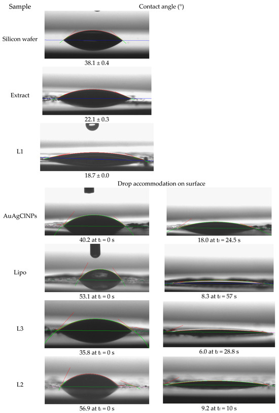 An evolution of the water drop behavior was observed on the L2, L3, AuAgClNP, and Lipo samples (see Figure 5). Immediately after the water drop is deposited, it spreads over the surface, and the equilibrium value is reached within 10 to 60 s. The water drop settles on the surface, exhibiting Cassie-type wetting. In contrast, the contact angle values obtained for the L1 and extract samples are lower and do not show significant evolution, indicating a hydrophilic character. This hydrophilic nature obtained on all the samples suggests an increase in the adhesion in composites, enhanced biocompatibility in implant devices, and better liquid spreading properties [45]. Consequently, the improved bioactivities make these samples suitable for use in living systems as adjuvants in various therapies.