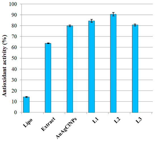 The in vitro antioxidant activity assessed by the chemiluminescence (CL) technique revealed the antioxidant properties of the samples (Figure 6). The biohybrids showed the greatest values of AA% (between 80.62 and 90.48%), while the bio-inspired lipid vesicles presented the lowest antioxidant activity (14.26%). Biohybrid L2 proved to be the best antioxidant system (AA = 90.48%). It is well known that vegetal extracts show free radical scavenging properties due to the presence of many bioactive molecules like phenolics (see Section 2.1 and Section 2.2). The main phenolics found in A. millefolium inflorescence are caffeoylquinic acids, neochlorogenic acid, chlorogenic acid, and caffeic acid [46], which are responsible for antioxidant behavior. The phytogenically metallic particles prepared in this work presented a higher value of AA% compared to the extract precursor due to their nanosize and their composition. These results are in line with our previous studies [17,24]. The potentiation of the antioxidant activities of biohybrids is observed due to the presence of biomimetic lipid membranes. These findings agree with our previous reports [17,24].