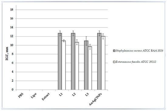 Figure 7. The in vitro antimicrobial activity of developed samples, expressed as diameters of the growth inhibition zone (IGZ, mm) evaluated by the agar well diffusion method.