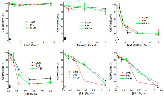 Figure 8. Cell viability curves recorded for all samples: (A)—Lipo, (B)—Extract, (C)—AuAgClNPs, (D)—L1, (E)—L2, (F)—L3, following 24 h of treatment for the three cell lines: L929, B16, and HT-29.