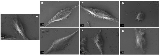 Figure 9. Morphological evaluation by the SEM of L929 cells grown in different conditions for 24 h: (A) control cells and cells treated with liposomes, (B) the extract, (C) AuAgClNPs, (D) L1, (E) L2, (F) and L3 (G). The scale bar is 4 µm.