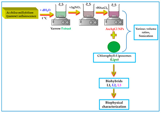 Figure 10. Schematic representation of the phyto-design of biohybrids containing yarrow-derived AuAgClNPs. The figure was created with Chemix (https://chemix.org/, accessed on 27 September 2024), PowerPoint (Windows 10 version), and Paint 3D (Windows 10 version), & Office 365.