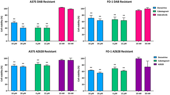 BRAF-Mutated Melanoma Cell Lines Develop Distinct Molecular Signatures After Prolonged Exposure to AZ628 or Dabrafenib: Potential Benefits of the Antiretroviral Treatments Cabotegravir or Doravirine on BRAF-Inhibitor-Resistant Cells