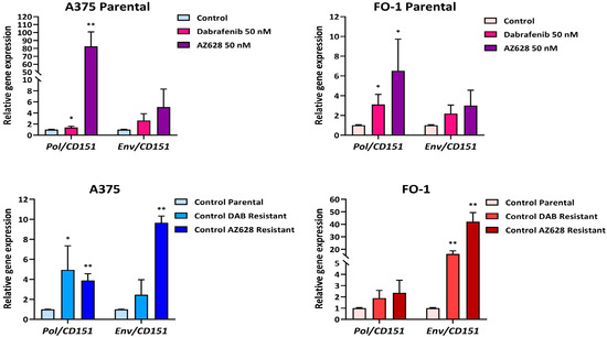 2.3. Administration of Antiretroviral Drugs and RAF Inhibitors Affect HERV-K Pol and Env Gene Expression