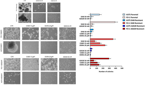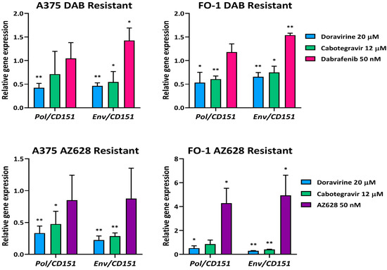 Chicago/Turabian StyleZanrè, Valentina, Francesco Bellinato, Alessia Cardile, Carlotta Passarini, Stefano Di Bella, and Marta Menegazzi. 2024. "BRAF-Mutated Melanoma Cell Lines Develop Distinct Molecular Signatures After Prolonged Exposure to AZ628 or Dabrafenib: Potential Benefits of the Antiretroviral Treatments Cabotegravir or Doravirine on BRAF-Inhibitor-Resistant Cells" International Journal of Molecular Sciences 25, no. 22: 11939. https://doi.org/10.3390/ijms252211939
