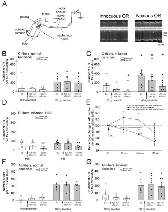 Effect of intra-articular injection of baricitinib on joint nociceptor responses to innocuous and noxious outward rotation (OR) of the normal and inflamed knee joint. (A) Experimental setup for in vivo recordings from joint nociceptors in anesthetized rats (left) and typical action potentials of a single nerve fiber evoked by innocuous and noxious OR (right). (B) No change in response magnitude of normal knee joint C-fibers (n = 6) to innocuous and noxious OR by baricitinib application (arrows). Fibers were continuously recorded for 180 min. (C) Reduction of C-fiber responses (n = 6) of the acutely inflamed joint to innocuous and noxious OR by baricitinib application. (D) No significant change of C-fiber responses (n = 6) to innocuous and noxious OR of the acutely inflamed joint by PBS. (E) Summary of the effects shown in (B–D). Baseline values before baricitinib or PBS injection were normalized to 100%. (F) No change in A∂-fiber responses (n = 5) of the normal knee joint to innocuous and noxious OR by baricitinib. (G) No change in A∂-fiber responses (n = 6) of the inflamed knee joint to innocuous and noxious OR by baricitinib. White circles and black bullets indicate single data points from individual fibers. * p < 0.05, Wilcoxon matched-pairs signed-rank test.