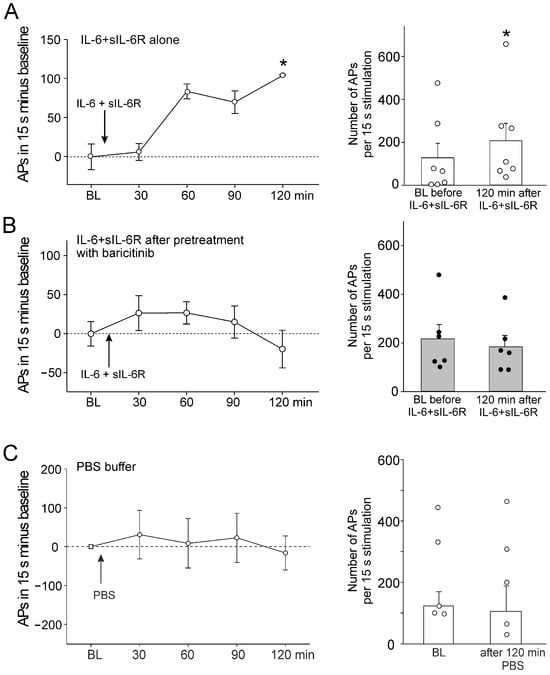 Control neurons were repeatedly tested without compound application. On average, neither current threshold (Figure 5D, columns 1 and 2) nor n-APs (Figure 5D, columns 7 and 8) were significantly altered. Application of IL-6 + sIL-6R significantly decreased the current threshold (Figure 5D, columns 3 and 4) and significantly increased n-APs (Figure 5D, columns 9 and 10) within 5–8 min. When IL-6 + sIL-6R was co-administered with baricitinib 1.0 µM, the current threshold was not significantly changed (Figure 5D, columns 5 and 6), and n-APs was significantly reduced (Figure 5D, columns 9 and 10). The application of baricitinib (1.0 µM) alone did not affect the current threshold and n-APs (Supplementary Figure S1).
