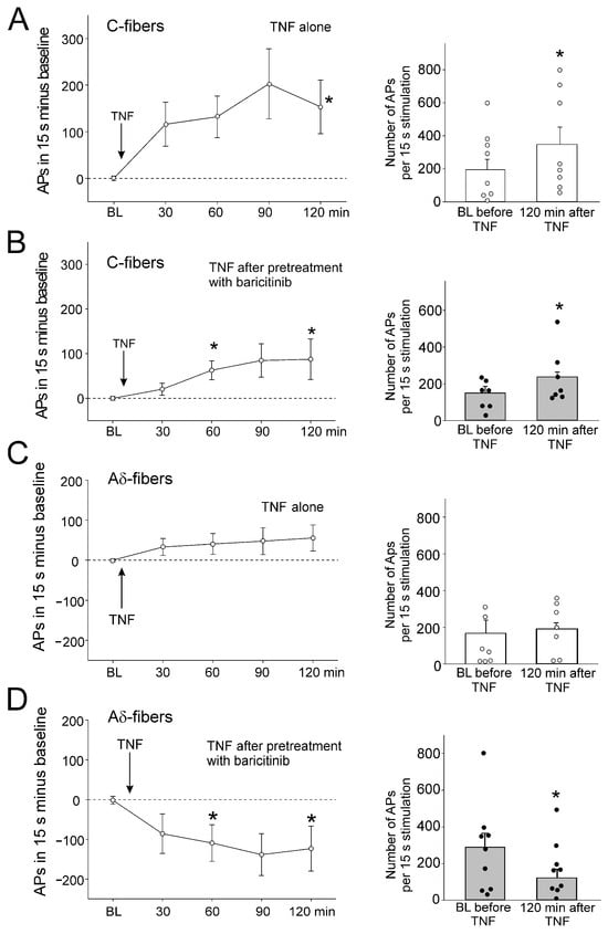 Effect of baricitinib on TNF-induced hyperexcitability of C-fibers. (A) Persistent increase in C-fiber responses (n = 8) to noxious OR by intra-articular injection of TNF (arrow). The right columns show responses before and 120 min after TNF. (B) Significant increase in responses of C-fibers (n = 7) to noxious OR by TNF after pretreatment of fibers with baricitinib for 60 min. (C) No significant change in responses of A∂-fibers (n = 7) to noxious OR by intra-articular injection of TNF. (D) Significant reduction of A∂-fiber responses (n = 8) to TNF after pretreatment with baricitinib for 60 min. White circles and black bullets indicate single data points from individual fibers. BL, baseline, * p < 0.05, Wilcoxon matched-pairs signed-rank test.