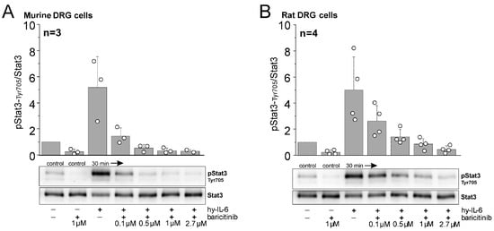 Western blot experiments on isolated, cultured DRG neurons from mice and rats showed some basal phosphorylation of Stat3 (pStat3), but stimulation with hyper-IL-6, a fusion molecule of IL-6 and sIL-6R [], strongly activated Stat3 (Figure 4A,B). Here, the ratio of pStat3/Stat3 is shown 30 min after stimulation, but strong Stat3 activation is already seen 15 min after stimulation, and initial increases begin 5 min after stimulation []. Baricitinib inhibited both basal Stat3 activation and hyper-IL-6-induced Stat3 activation in a dose-dependent manner. These data clearly demonstrate that DRG cells are a target for baricitinib.