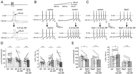 Using whole-cell patch-clamp recordings from small- to medium-sized neurons (most of which are nociceptive), we investigated whether baricitinib interferes with the effect of IL-6 + sIL-6R on the neuronal excitability of isolated and cultured DRG neurons. Using a step protocol, we tested at what current intensity action potentials (APs) are elicited (Figure 5A). Using a ramp protocol, we tested how many APs (n-APs, number of APs) are elicited during the current ramp. Figure 5B,C show typical specimens. Repeated stimulation without bath application of a compound did not change n-APs (Figure 5B, column 1, control—control). Application of IL-6 + sIL-6R after superfusion with buffer solution (Figure 5B, column 2, control—IL-6 + sIL-6R) increased the induced n-APs within 3 min. When IL-6 + sIL-6R was applied together with baricitinib, n-APs were not increased (Figure 5C, column 1). After preincubation of the Stat3 inhibitor Sta21 for at least 30 min, only one additional AP was added by co-application of IL-6 + sIL-6R and Sta21 (Figure 5C, column 2).