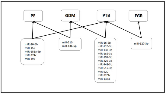 | 2019 [58] | Exosomes | Plasma | PE (n = 43) Gestational hypertension (n = 57) FGR (n = 63) Normal (n = 102) | 10–13 weeks | Commercial kit miRCURY (Qiagen, Valencia, CA, USA), qRT-PCR | Low levels of miR-517-5p, miR-520a-5p and miR-525-5p in the first trimester are associated with subsequent pregnancy complications |