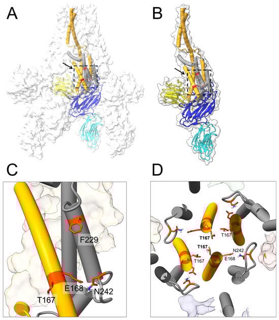 Location of residues mutated in the Vip3Aa protoxin (PDB: 6TFJ). (A) Atetrameric model of Vip3Aa, where one of the monomers is shown in color and the other three only as a transparent surface. The four residues mutated are indicated (red orange) and highlighted with a dotted rectangle and arrow. The five domains (I–V) of the toxin monomer are color-coded in orange (1–198), grey (199–325), blue (326–536), yellow (537–675), and cyan (676–789), respectively. (B) Same as (A) but showing a single monomer. (C) A close-up of the four residues mutated, seen from the tetrameric interface, where N242, T167, and E168 were mutated to Cys and F229 to Tyr. (D) The top view of the protoxin tetrameric interface, where two T167 residues are in close proximity (bold) whereas the other two are too far away to interact. Nearby residues E168 and N242, which may form interactions, are also shown.