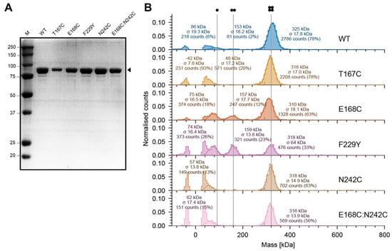 After expression and purification, both WT and mutant protoxins produced a single band in SDS gels, with a molecular mass consistent with the expected 86 kDa monomer (Figure 2A). We note that despite the nominal load being the same (2.5 μg), T167C apparently contained less protein. Since the tetrameric form of the protoxin is not captured in SDS gels, the samples were examined using mass photometry (Figure 2B), a new technology that uses light interference to measure single particle mass and which provides direct information on particle heterogeneity in an aqueous solution, i.e., without detergent []. Whereas all of the samples showed the expected band consistent with tetramers (~320 kDa), mutants E168C and F229Y also showed a significant proportion of dimers, indicating a higher tendency of the tetramer to dissociate in these mutants. These two samples also contained a significant population with masses lower than expected for monomers, merged with the noise peak (symmetrical peaks centered at 0 kDa), suggesting monomer degradation (the lower limit of detection for MP is ~40 kDa). It is also noticeable that for all mutants, the particle count for the tetramer was lower than for the WT, especially for the domain II mutants F229Y and N242C and the double mutant, with about 25% of the counts relative to the WT. We speculate that this is due to the formation of very large aggregates in these mutants before measurement, which cannot be detected by mass photometry (>5 MDa). Small errors during the necessary dilutions of the sample (2 µL into 18 µL) may also contribute to these variations. In CD spectra, only minor differences were observed in the near UV range (Figure S1).