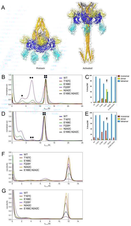 When the plots in panels B–D were not normalized, this allowed comparison of relative protein abundance in the AUC cell between samples (Figure 3F,G). For the protoxins (Figure 3F), F229Y and E168C showed a lower concentration whereas the most abundant tetramer was that of T167C and N242C. This is despite all samples being initially loaded at the same concentration as measured by absorbance. Similar results were obtained for the activated sample (Figure 3G). This loss of protein may be due either to degradation of the monomers, as shown by the high intensity below 1S in most samples, or to higher aggregation that results in protein accumulation at the bottom of the cell. In summary, the best-behaved mutants in terms of protein loss and (lack of) tetrameric dissociation were T167C and N242C.