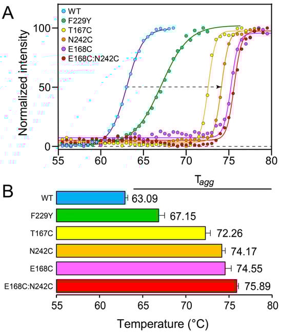 The thermal stability of the protoxin samples was tested using DSLS in a Stargazer-386 machine, which measures the aggregation of the protein with temperature. In all mutants, scattering increase occurred at a higher temperature than in the WT (Figure 4), even for F229Y, which showed a larger dissociation into dimers (Figure 2B and Figure 3B). This suggests that the thermal stability observed here does not correlate with tetrameric integrity. The Tagg for other mutants was more than 10 °C higher than the WT, in particular E168C, N242C and the double mutant E168C:N242C. The observed increase in Tagg is comparable to those obtained in a mutagenesis study to improve the thermal stability of viral and mammalian proteins [].