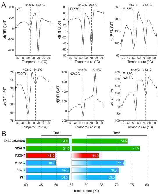 The thermal stability of the protoxin samples was also measured by DSF using SYPRO Orange dye, which binds the protein hydrophobic regions that become exposed during thermal unfolding (Figure 5). The samples showed the two melting temperatures described previously, which correspond to the unfolding of domains IV–V (lower temperature Tm1) and domains I–III (higher temperature Tm2) []. Tm1 for the mutants was close to that of the WT, except in E168C and F229Y, where it was lower by ~4 °C. These two mutants also showed the largest concentration of dimers in the MP and AUC experiments (Figure 2B and Figure 3B), which suggests that tetramerization stabilizes domains IV–V. For F229Y, Tm2 was also lower than the WT by 5 °C; therefore, it is the least thermostable mutant. For all the other mutants, Tm2 was higher than the WT, in a trend that somewhat correlates with the Tagg data (Figure 4B), so that with the exception of the WT, increased stability in DSLS appears to correlate with the stability of domains I–III (Tm2). These results underscore the need to perform multiple and complementary assays to characterize these samples. Looking at Tm2, N242C and the double mutant E168C:N242C were the most stable by DSF (4–8 °C increase vs the WT), consistent with Tagg data (Figure 4). We note that the second transition temperature for N242C is marked by a positive peak instead of a negative one. We are at present unable to explain this feature which was reproducible in three different samples.