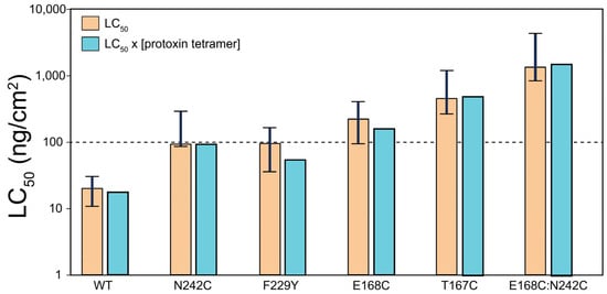 The toxicity of the Vip3Aa mutants against S. exigua was compared to the WT (Table 1). For clarity, we also represent these results graphically, and in logarithmic scale (Figure 6). It is clear that the WT is the most toxic species, followed by mutants N242C and F229Y (Figure 6, orange). However, since the different samples show varying proportions of tetramer in AUC and mass photometry (see Figure 2B and Figure 3B), we attempted to normalize these results to account for the actual proportion of tetramer protoxin that may be present in the toxicity assay. This was carried out by multiplying the LC50 with the estimated fraction of tetramer, i.e., from 1 if all of the sample is tetrameric to 0 if the sample is not tetrameric, obtained from AUC and mass photometry. For example, the mutant F229Y has slightly lower toxicity than N242C (Figure 6, orange), but the amount of tetramer responsible for this toxicity is likely lower than that of N242C, which translates into a lower effective LC50 for F229Y than the one observed. Taking this into account, we conclude that the most toxic mutant after the WT was F229Y, i.e., the least stable of the mutants (Figure 4 and Figure 5) and the one that showed more tetramer dissociation (Figure 3). This was followed by N242C, which was also the most stable mutant as found via DSF (Figure 5). The double mutant showed the lowest toxicity despite being one of the most stable mutants (Figure 4 and Figure 5), suggesting that higher stability was obtained at the cost of impaired functionality.