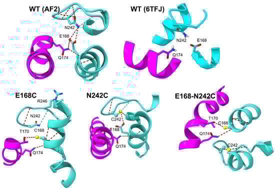 Comparison of the possible interactions of protoxin residues 242 and 168. In the WT AF2-predicted structure, N242 forms hydrogen bonds with E168 of the same monomer (cyan), and the latter forms another via main chain atoms with Q174 of a different monomer (magenta). In the experimental structure (6TFJ), these three residues are close, although too far to form hydrogen bonds. In the E168C mutant, the AF2-predicted model shows that the introduced cysteine can form hydrogen bonds with T170 of a neighboring monomer in addition to the aforementioned interaction with Q174, also present in the AF2-predicted models of mutants N242C and the double mutant. N242C may form three possible interactions with the same monomer, one of which is with E168.