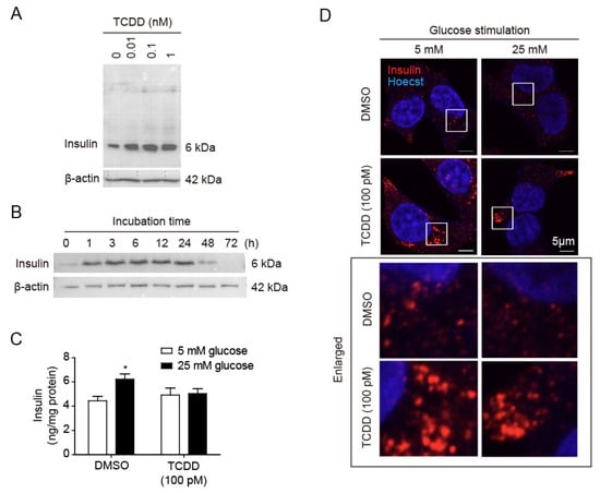 Effects of TCDD on insulin secretion in RIN-m5F pancreatic β-cells. Cells were treated with concentrations of TCDD and different periods of time, and the insulin levels were analyzed by different methods. (A) Western blot of cell lysates incubated with different concentrations of TCDD for 24 h, using β-actin as a loading control. (B) Western blot analysis of cell lysates after treatment with 100 pM TCDD for the indicated time periods. (C,D) Glucose-stimulated insulin secretion (GSIS). Cells incubated with or without 100 pM TCDD for 24 h were stimulated with 5 mM or 25 mM glucose for 1 h, culture media harvested for ELISA, and cells used for immunocytochemistry. (C) Quantification of secreted insulin by ELISA. Significant decrease in GSIS with TCDD treatment as compared to the control. Data represent the mean ± SEM (n = 3). * p < 0.05 vs. DMSO control. (D) Immunocytochemistry and confocal microscopy to visualize intracellular insulin. Enlarged white boxes from upper panels in lower panels.