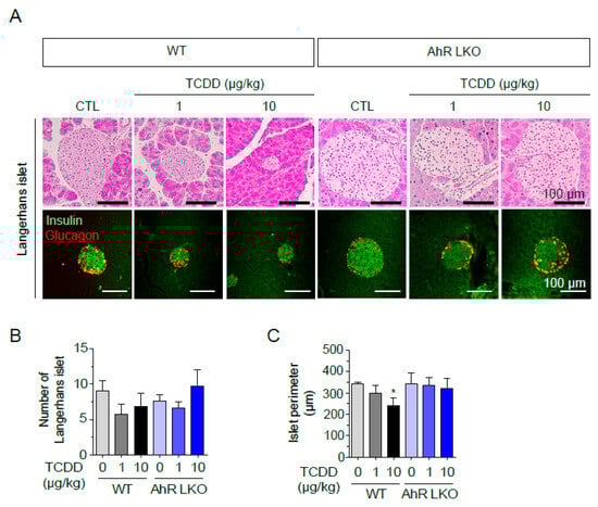 Liver AhR-dependent loss of pancreatic islets by TCDD injection. AhR-LKO mice retain pancreatic islets after TCDD injection. Pancreas was isolated from mice (WT or AhR-LKO) fed a normal chow for 12 weeks after intraperitoneal injection of TCDD (0, 1, or 10 μg/kg). (A) H&E staining of paraffin sections of mouse pancreas (top), and double immunostaining of paraffin sections with anti-insulin (green) and anti-glucagon (red) antibodies (bottom). (B) Number of Langerhans islets. (C) Perimeter per islet calculated by Mingmei camera at magnification: 200× (μm). Data represent the mean ± SEM. * p < 0.05 vs. control (n = 5~6).
