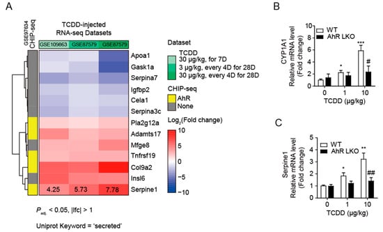 TCDD increased Serpine1 mRNA levels in the liver in an AhR-dependent manner. (A) Heatmap of differentially expressed genes, which are annotated with the UniProt keyword “secreted”, in all three RNA-seq datasets. Fold changes (FC) are shown as repressed (blue) or induced (red). (B,C) Quantitative RT-PCR. Relative mRNA levels of Cyp1A1 (B) and Serpine1 (C) were determined in mouse liver from WT and AhR-LKO mice i.p. injected with TCDD (0, 1, or 10 μg/kg). Mice were on a normal diet, and liver tissues were collected 12 weeks after the TCDD injection. Data represent the mean ± SEM (n = 5~7). * p < 0.05, ** p < 0.01, *** p < 0.001 vs. control; # p < 0.05, ## p < 0.01 vs. WT.