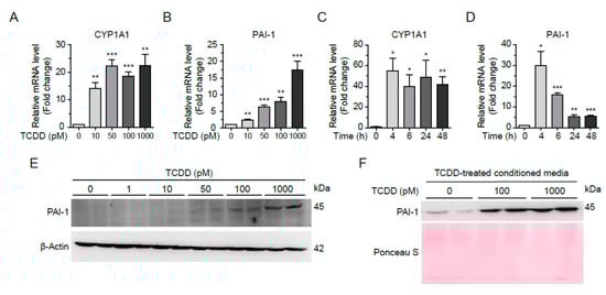 TCDD induced expression and secretion of PAI-1 in Hepa1c1c7 cells. (A,B) Dose-dependent changes of mRNA. Hepa1c1c7 cells were incubated with TCDD 0, 10, 50, 100, or 1000 pM for 24 h, and mRNA levels of CYP1A1 (A) and PAI-1 (B) were analyzed by qRT-PCR. (C,D) Time-dependent changes of mRNA. Hepa1c1c7 cells were incubated with 100 pM TCDD for 0, 4, 6, 24, or 48 h, and mRNA levels of CYP1A1 (C) and PAI-1 (D) were analyzed by qRT-PCR. The mRNA level was normalized by 18S rRNA. Data represent the mean ± SEM (n = 3). * p < 0.05, ** p < 0.01, *** p < 0.001 vs. DMSO-treated cells. (E) Hepa1c1c7 cells were incubated with TCDD for 24 h as designated, and the cell lysates were analyzed by Western blot using an antibody against PAI-1. β-Actin was used as a loading control. (F) Cells were incubated with DMSO or TCDD (100 or 1000 pM) in MEMα media containing 10% CS-FBS for 24 h. The culture media were changed to serum-free RPMI 1640, and the cells were incubated for 24 h. Proteins in the collected conditioned media were precipitated by MeOH/CHCl3 and analyzed by Western blot using anti-PAI-1 antibody. The Ponceau S-stained image was used as a loading control.