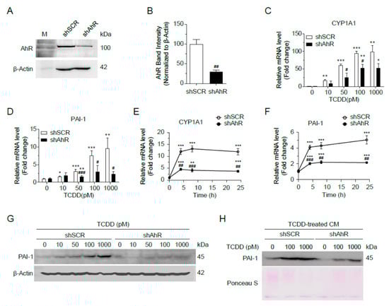 AhR-dependent induction of PAI-1 by TCDD. (A,B) Hepa1c1c7 cells were transfected with shSCR or shAhR. The expression of AhR was analyzed by Western blot (A) and intensities of AhR bands normalized by β-Actin (B). (C,D) Dose-dependent changes of mRNA. shSCR- or shAhR-transfected Hepa1c1c7 cells were incubated with TCDD as indicated for 24 h, and mRNA levels of CYP1A1 (C) and PAI-1 (D) were analyzed by qRT-PCR. (E,F) Time-dependent changes of mRNA. shSCR- or shAhR-transfected Hepa1c1c7 cells were incubated with 100 pM TCDD for 0, 4, 6, 24, or 48 h, and mRNA levels of CYP1A1 (E) and PAI-1 (F) were analyzed by qRT-PCR. The mRNA levels were normalized by 18S rRNA. Data represent the mean ± SEM (n = 3). * p < 0.05, ** p < 0.01, *** p < 0.001 vs. DMSO-treated cells. # p < 0.05, ## p < 0.01, ### p < 0.001 vs. shSCR. (G) shSCR- or shAhR-transfected Hepa1c1c7 cells were incubated with TCDD at the indicated concentrations for 24 h and analyzed by Western blot using anti-PAI-1 antibody. β-Actin was used as a loading control. (H) shSCR- or shAhR-transfected Hepa1c1c7 cells were incubated with DMSO or TCDD (100 or 1000 pM) in MEMα containing 10% CS-FBS for 24 h, followed by further incubation in serum-free RPMI 1640 for 24 h to collect conditioned media. Proteins in the conditioned media were precipitated by MeOH/CHCl3 and analyzed by Western blot using anti-PAI-1 antibody. The Ponceau S-stained image was used as a loading control.