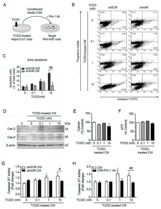 PAI-1 secreted by TCDD from Hepa1c1c7 cells induced apoptosis in RIN-m5F cells. (A) Graphical scheme of the conditioned media transfer experiment. Hepa1c1c7 cells were incubated with DMSO or 100 pM TCDD in MEMα containing 10% CS-FBS for 24 h. Conditioned media were collected 24 h after media change to serum-free RPMI 1640, and RIN-m5F cells were incubated in the conditioned media containing 10% CS-FBS for 24 h, with or without PAI-1 antibody. (B) After incubation with the conditioned media from shSCR- or shAhR-transfected Hepa1c1c7 cells, the RIN-m5F cells were stained with Annexin V and propidium iodide (PI), and apoptosis was monitored through flow cytometry. The X and Y axes show Annexin V and PI staining markers, for apoptosis and necrosis, respectively. Each plot is divided into four regions. The lower-left region shows cells negative for both Annexin V and PI (living cells); the lower-right region shows cells positive for Annexin V only (early apoptotic cells); the upper-left region shows cells positive for PI only (necrotic cells); the upper-right region shows cells positive for both. (C) Quantitative graph of early apoptotic cells as % of total cells. (D) Western blot against Caspase-3 and Caspase-8 after incubation with conditioned media for 24 h (C: control for incubation with conditioned media). β-Actin was used as a loading control. (E,F) After incubation in conditioned media, the cell viability and mitochondrial activity were measured by calcein (E) and intracellular ATP contents (F), respectively. (G,H) A Caspase-3/7 assay was performed after incubation with conditioned media from shSCR- or shAhR-transfected cells (G) or from Hepa1c1c7 cells with or without PAI-1 antibody (H). Data represent the mean ± SEM (n = 3~5). * p < 0.05, ** p < 0.01 vs. control; # p < 0.05, ## p < 0.01 vs. shSCR.